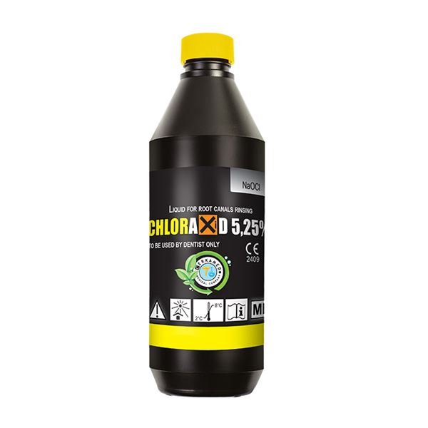 5,25% roztok chlornanu sodného na vyplachování, čištění a dezinfekci kořenového kanálku během a po endodoncii.