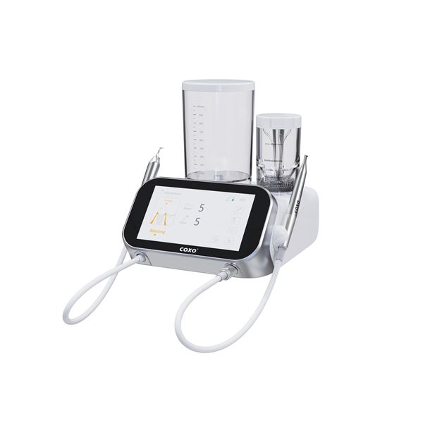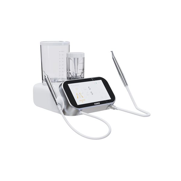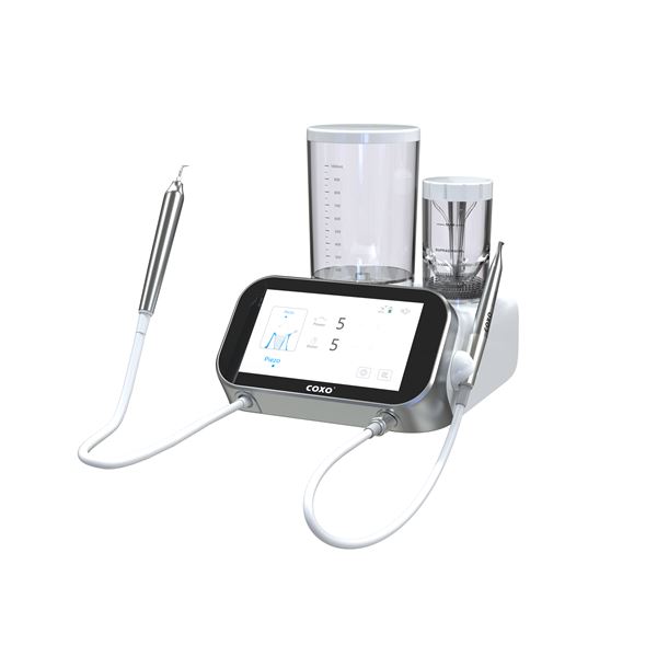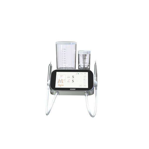 COXO PT Master je moderní víceúčelový přístroj pro profesionální dentální hygienu, který kombinuje ultrazvukové ošetření a pískování vzduchem s abrazivem. Je navržen pro šetrné, bezbolestné a vysoce účinné odstranění zubního kamene, plaku i pigmentací, včetně péče o implantáty.