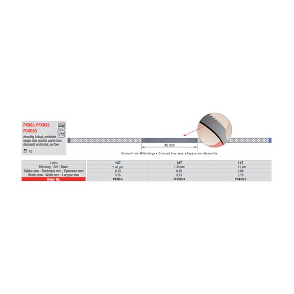 Jednostranně sypané diamantové pásky různé zrnitosti délky 147 mm. Používají se pro úpravu amalgámových, kompozitních a skloionomerních výplní. Dodávají se v provedení bez pilky, s pilkou nebo perforo...