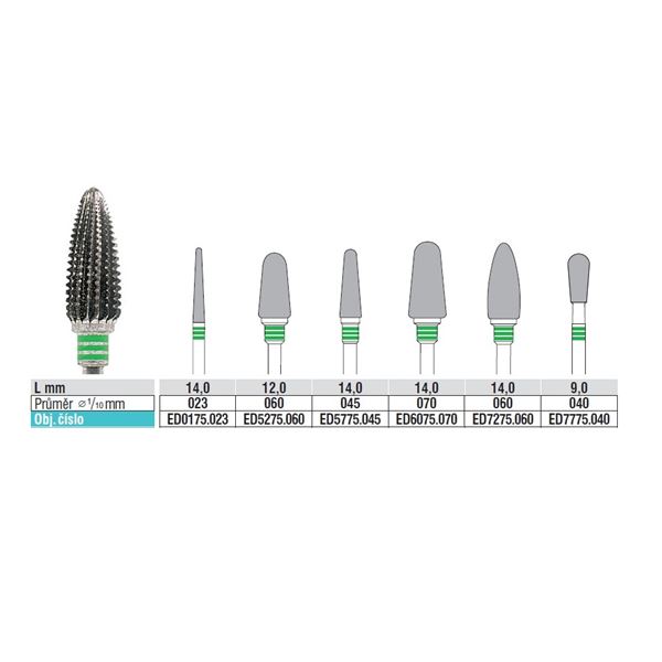 Používají se pro opracování materiálů jako např. chromkobaltových a chromniklových slitin, ušlechtilých dentálních slitin, titanu, keramiky, kompozitů, pryskyřic, sádry, měkkých rebazovacích a podklad... Celý popis