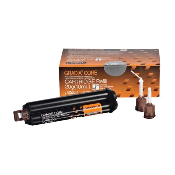 Balení : 10 ml Gradia Core, , 20× míchací kanyly, 20× endokoncovky.