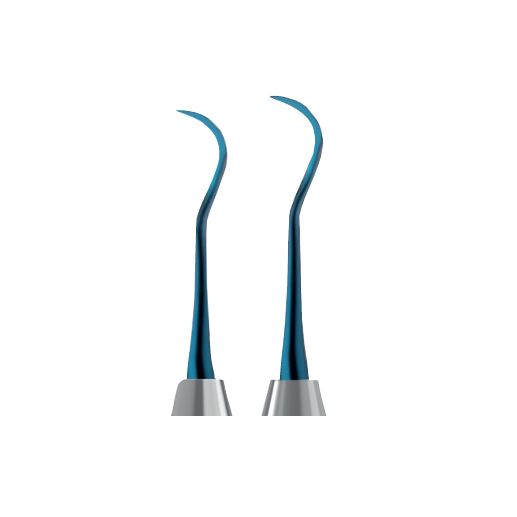Nástroje na úpravu kompozit s modrou titan oxidovou vrstvou k redukci adhezivního účinku kompozit. Jemný scaler pro odstranění přebytků kompozit.