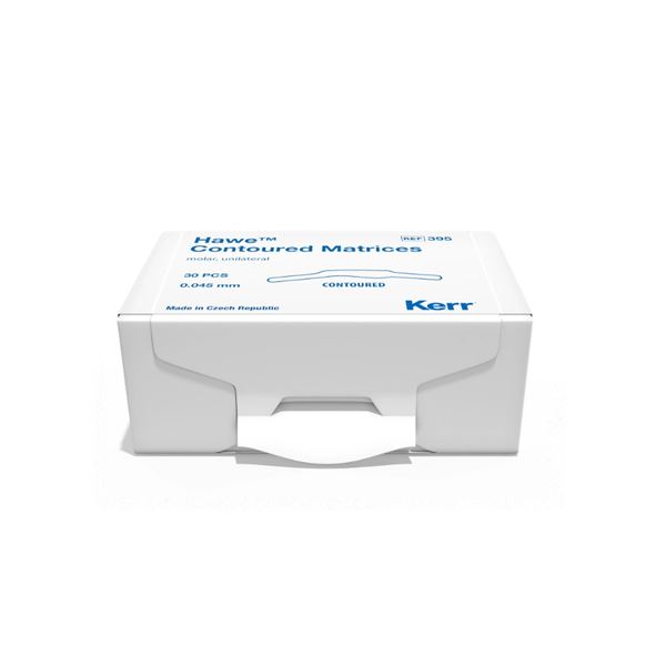 Různé tvary a síly kovových tvarovaných matric pro výplně v distálním úseku chrupu. Všechny tyto typy matric je možné použít v kombinaci s napínacím systémem SuperMat. Balení 30ks.
