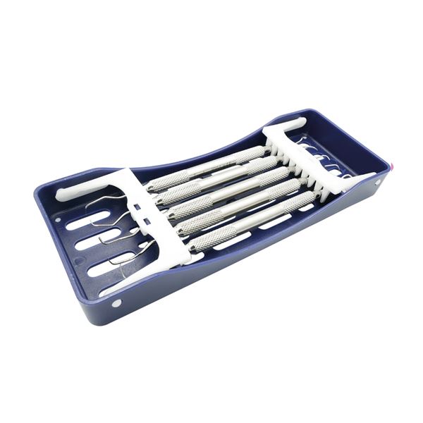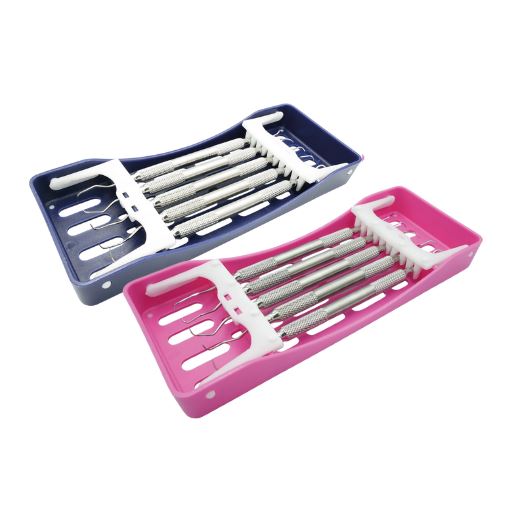 Základní parodontologický set kyret 5/6, 7/8, 11/12, 13/14, scaler H6/H7. Součástí setu je sterilizační kazeta modrá, vhodná pro sterilizaci do 134°.