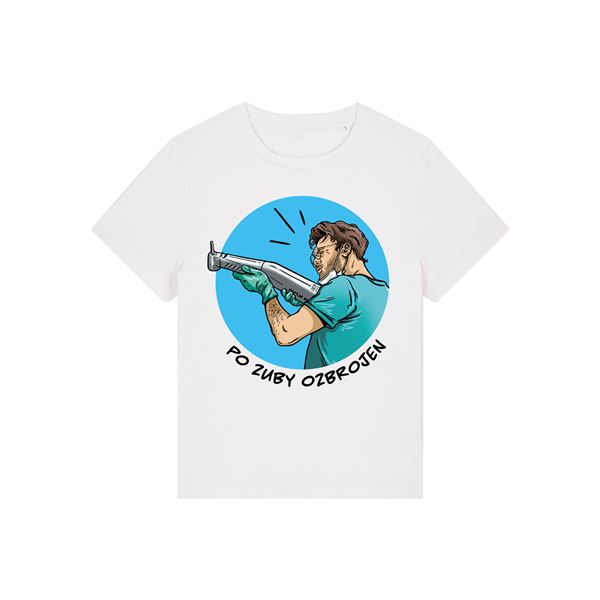 Stylové tričko v medium fit střihu v limitovaném zubařském designu, příjemné na celodenní nošení. Vsazené rukávy, žebrovaný lem u výstřihu, zpevňující páska v zátylku, pevné dvojité prošití. Materiál: 100% bavlna.
