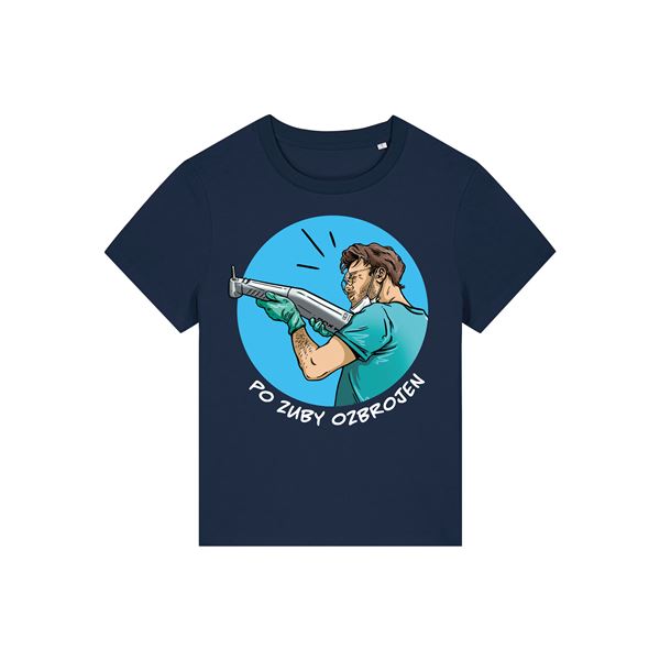 Stylové tričko v medium fit střihu v limitovaném zubařském designu, příjemné na celodenní nošení. Vsazené rukávy, žebrovaný lem u výstřihu, zpevňující páska v zátylku, pevné dvojité prošití. Materiál: 100% bavlna.